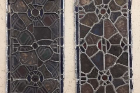 Shalan Stained Glass is currently collaborating with four other stained glass studios on the restoration of the stained glass windows at The Riverside Church, New York, N.Y. Our studio is restoring the 27 triforium windows which were designed by Harry Wright Goodhue of Boston, MA. Included here are photos of two windows in-situ, before restoration along with two photos of the windows in the studio as we begin the restoration process. We'll be posting more photos of this project this winter as the work progresses.